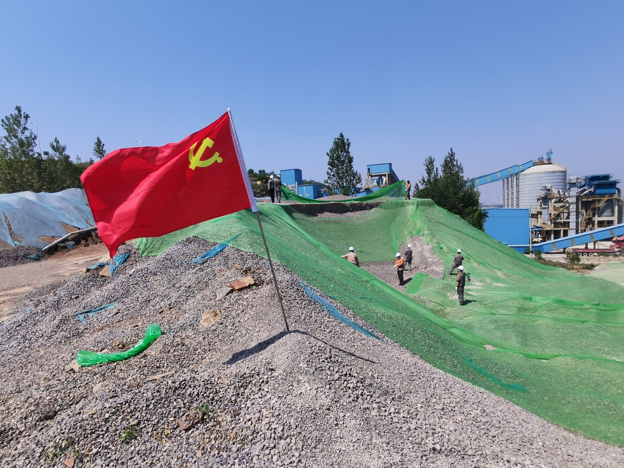 一個(gè)支部就是一座堡壘,一名黨員就是一面旗幟,行動(dòng)是最有力的帶動(dòng),示范是最鮮明的垂范。為牢固樹(shù)立綠色礦山發(fā)展理念,堅(jiān)決貫徹落實(shí)“綠水青山就是金山銀山”政策,2023年6月8日上午,通鳴黨支部組織黨員同志到汽修房處對(duì)裸露在外的石料進(jìn)行防塵網(wǎng)的覆蓋,黨員同志們冒著酷暑,不畏炎熱,沖鋒在前,經(jīng)過(guò)一上午的努力,最終克服困難順利完成任務(wù)。通鳴黨支部著力發(fā)展基層黨組組織的戰(zhàn)斗堡壘作用和黨員的先鋒模范作用,通鳴黨支部始終堅(jiān)守初心、擔(dān)當(dāng)使命,敬業(yè)愛(ài)崗,用自己的實(shí)際行動(dòng)讓黨旗飄揚(yáng)在最高處。