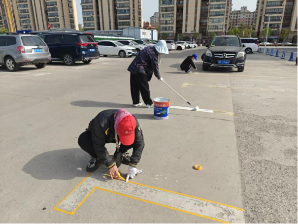 活動現(xiàn)場,黨員們手持專業(yè)工具,對體育場內(nèi)的車位線進行覆描。大家分工明確,有的負責(zé)測量車位尺寸,有的負責(zé)涂刷標線,還有的負責(zé)現(xiàn)場秩序維護,確保覆描工作有序進行。