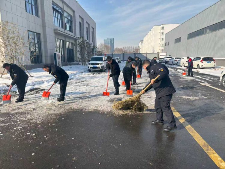 保安公司對(duì)辦公樓前、主干道等區(qū)域的積雪進(jìn)行人工清理,重點(diǎn)鏟除路面結(jié)冰區(qū)域,確保人員與車(chē)輛通行安全。