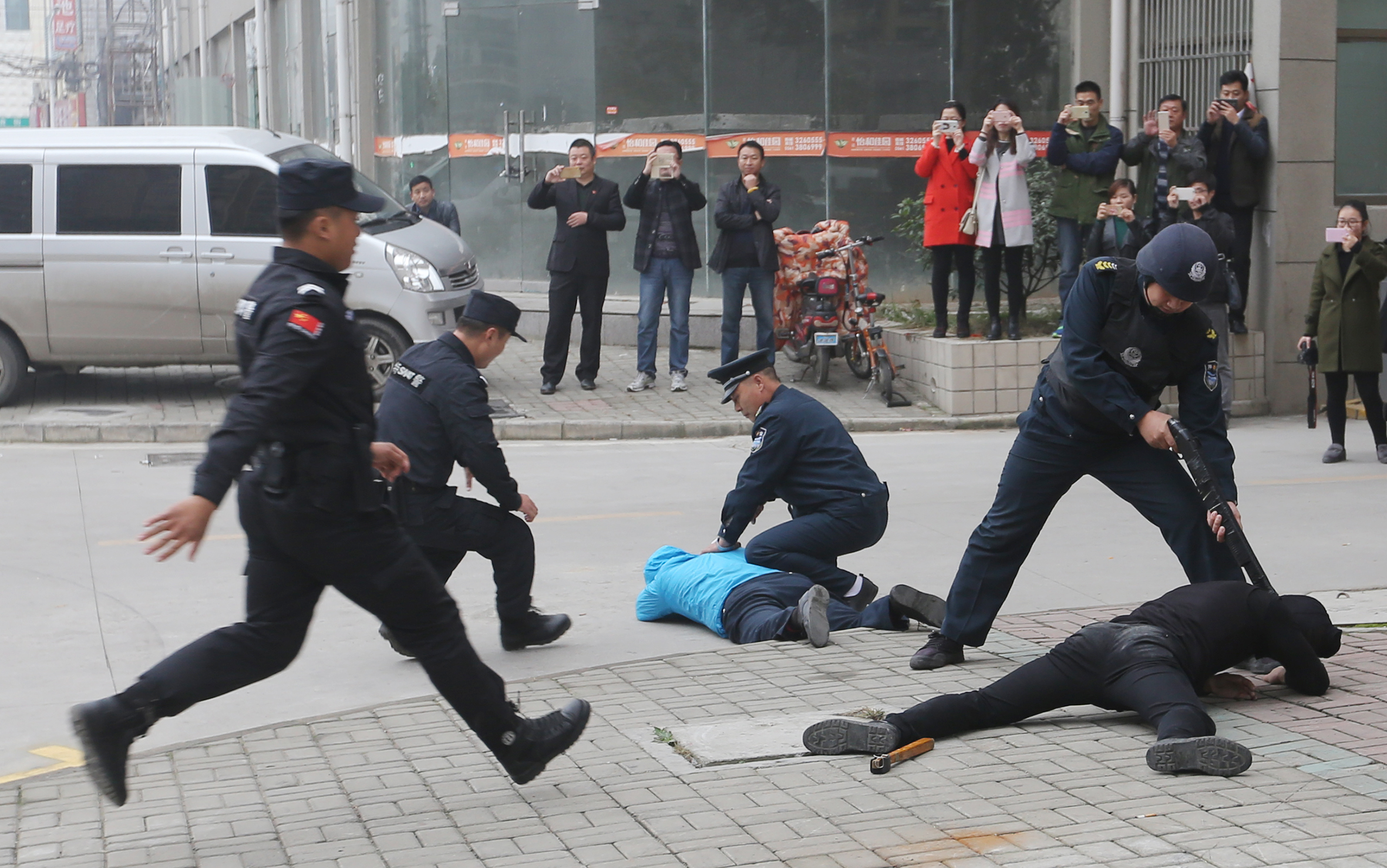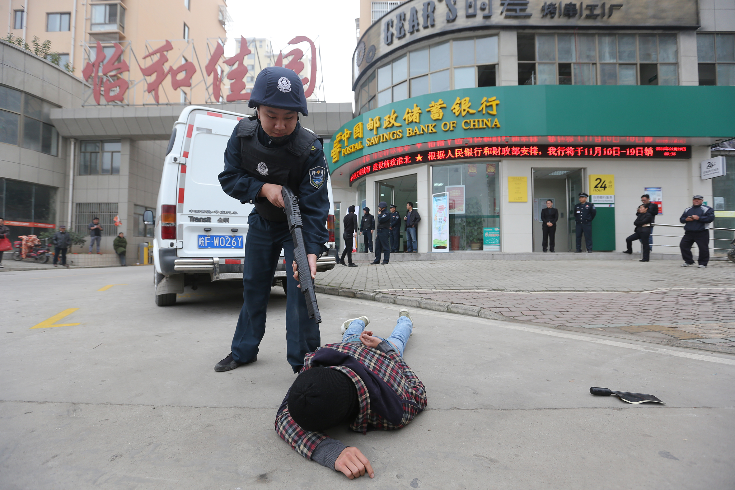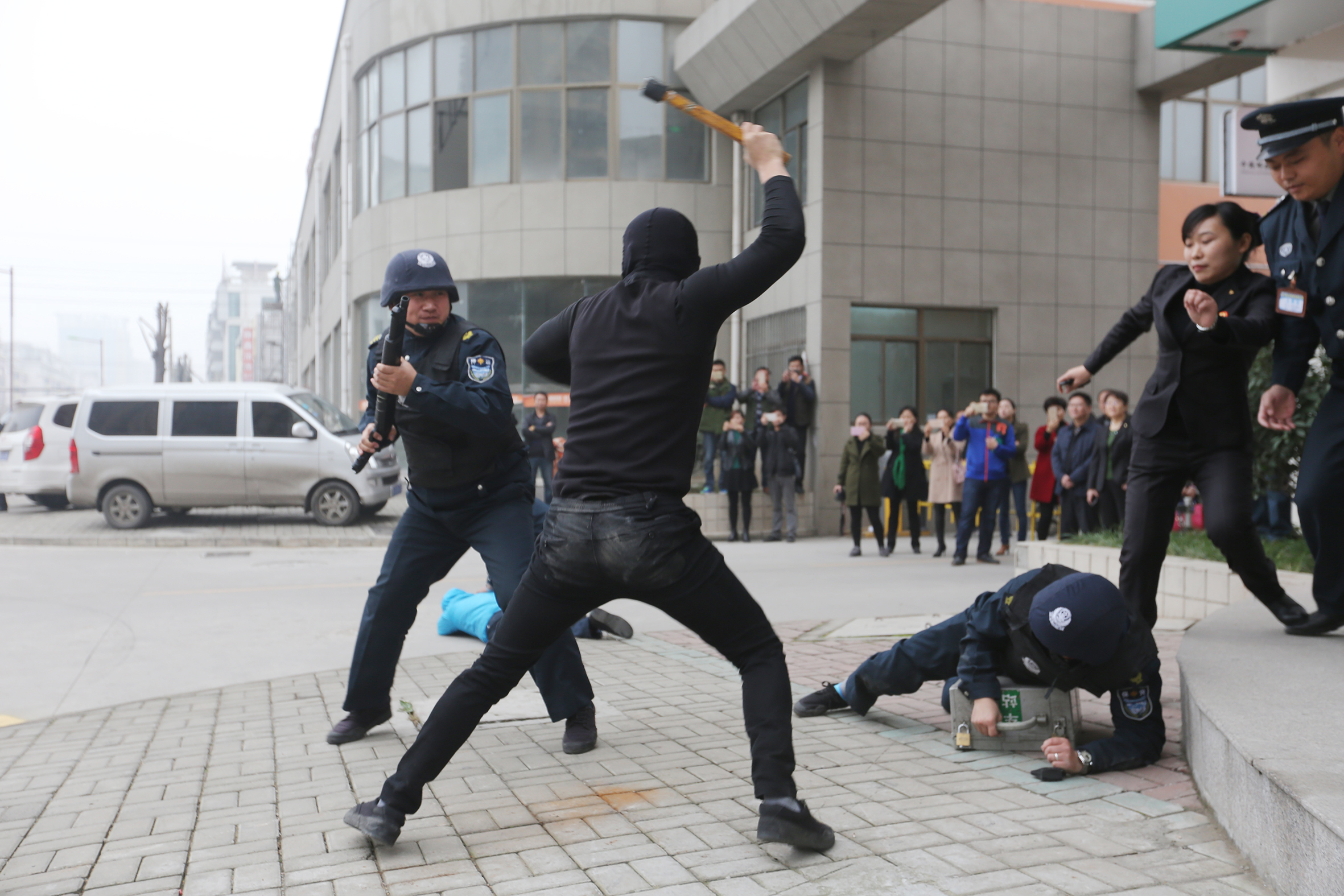 為切實提高押運隊員安全防范意識,使押運隊員進(jìn)一步熟悉和掌握防暴力搶劫應(yīng)急預(yù)案流程,增強員工應(yīng)對突發(fā)事件的處置能力和實戰(zhàn)能力,按照中國郵政儲蓄銀行安全保衛(wèi)工作要求,淮北市保安有限公司聯(lián)合特警支隊、中國郵政儲蓄銀行于2016年11月19日上午9時在中國郵政儲蓄銀行惠苑路支行處實施運鈔車突遇犯罪份子持刀搶劫款箱應(yīng)急置預(yù)案聯(lián)合演練。