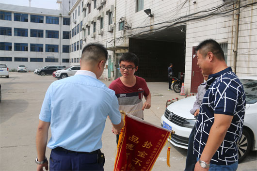 2018年6月19日10時(shí),淮北市保安有限公司派駐淮北車管所人防一中隊(duì)隊(duì)員房德寶在大廳巡邏執(zhí)勤時(shí)拾到一錢包,內(nèi)有機(jī)動(dòng)車駕駛證、多張銀行卡、身份證件及現(xiàn)金600元。第一時(shí)間交給車管所領(lǐng)導(dǎo)并通過(guò)數(shù)據(jù)系統(tǒng)與家住亳州市渦陽(yáng)縣的張建飛取得聯(lián)系。失主表示萬(wàn)分感謝,并為公司送來(lái)錦旗。