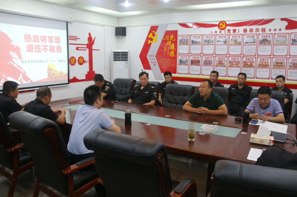 “八一”建軍節(jié)來臨,為慶祝中國人民解放軍建軍92周年,做好退役軍人慰問和組織關(guān)懷工作,淮北市保安有限公司于8月1日上午,召開以“熱血鑄軍魂·退伍不褪色 ”為主題的復(fù)員退伍軍人座談會。邀請公司退役軍人代表參加了座談。